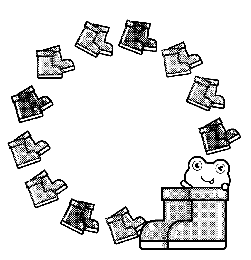 赤、青、黄色の長靴とカエルの飾り罫イラスト