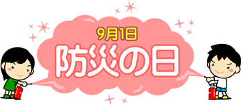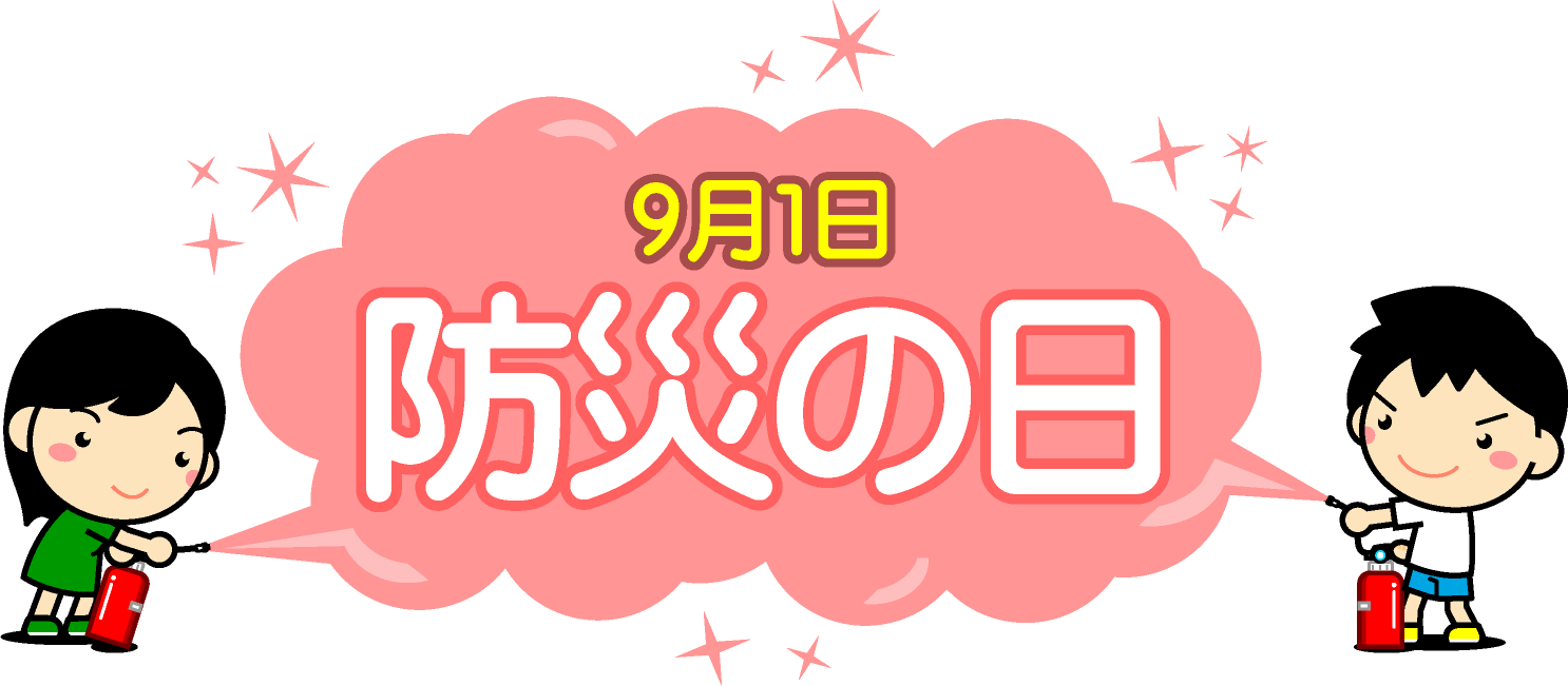 9月イラスト。9月1日、防災の日の文字/消火器で消火する子供素材。