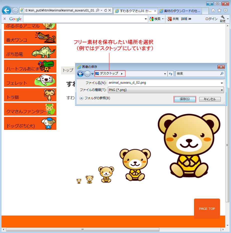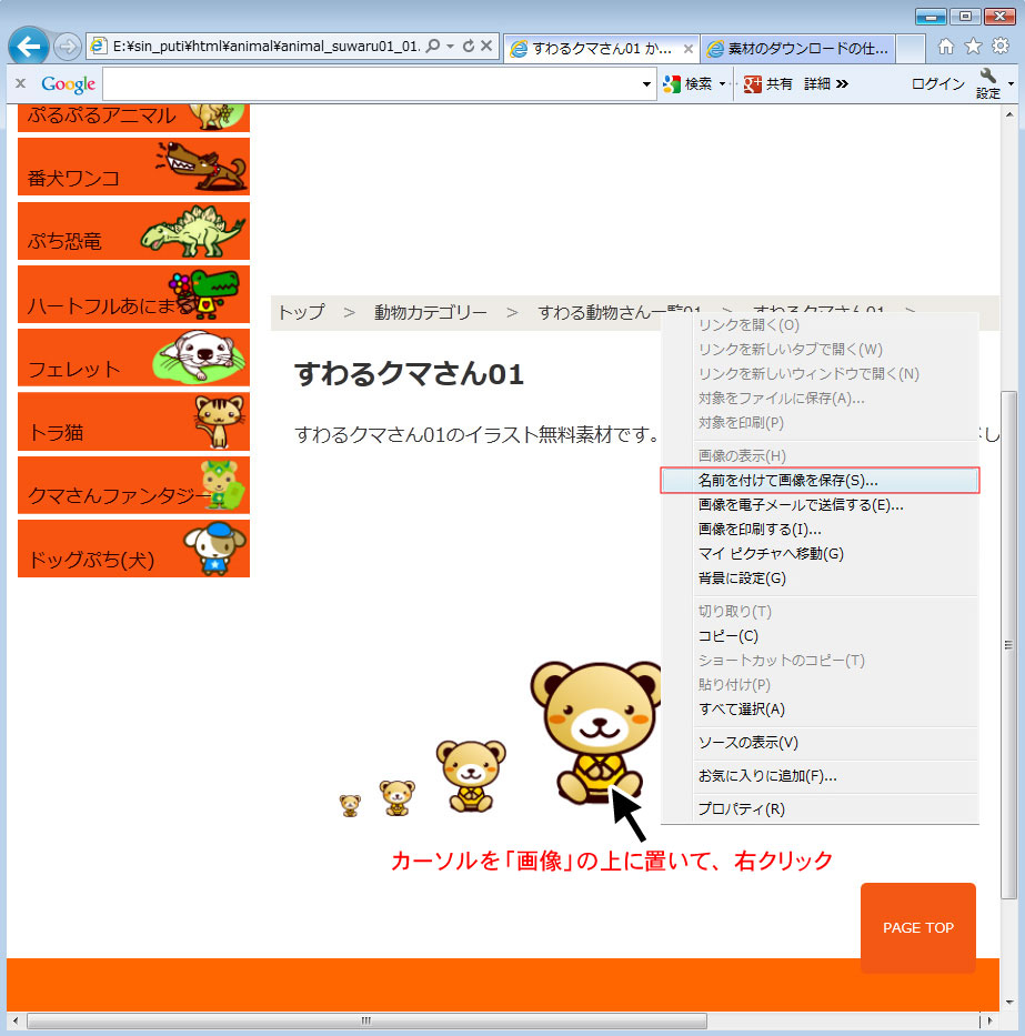 ①素材のプチッチのホームページにあるイラスト画像の上にカーソルを合わせ、右クリックをしてください。すると、小さな画面が出てきますので、上から7番目にある 名前を付けて画像を保存という項目を選んでください。