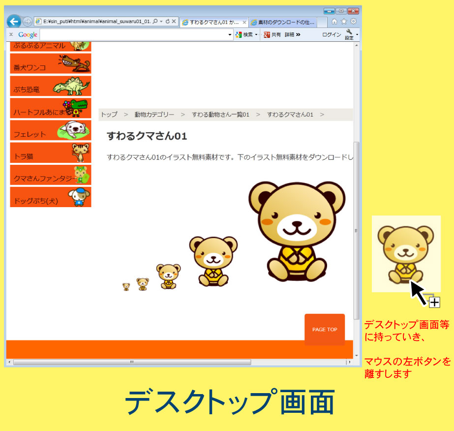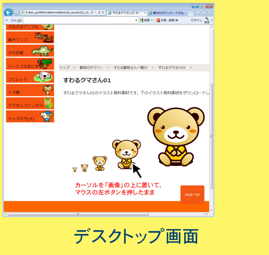 ①イラストや画像の上にカーソルを合わせ、マウスの左ボタンをクリック(押)してください。