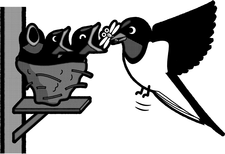 ツバメのイラスト。雛に食べ物を運ぶ燕のイラスト2素材。