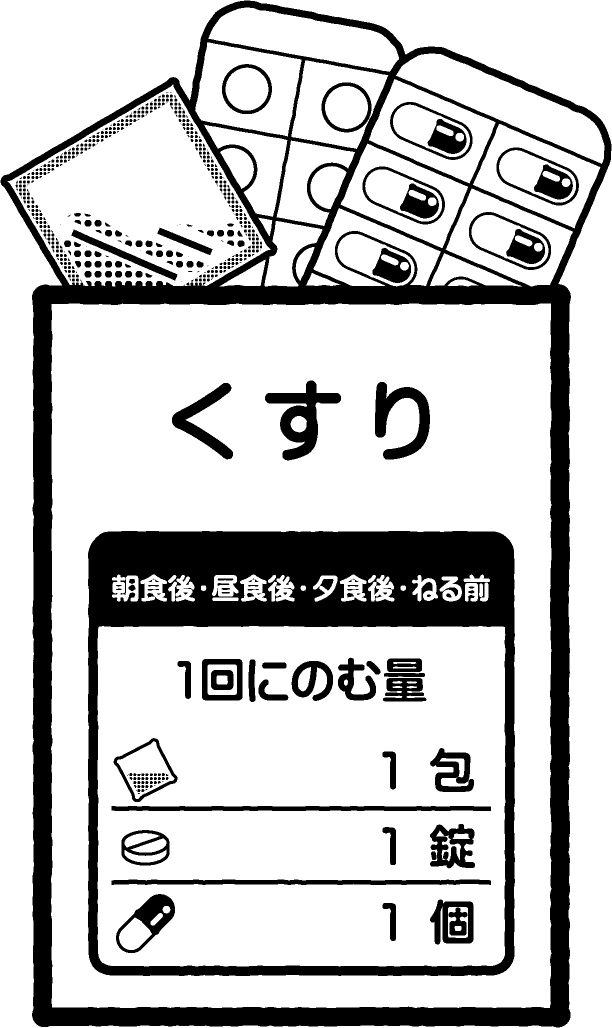 病院のイラスト。薬袋から出ている薬のイラスト素材。