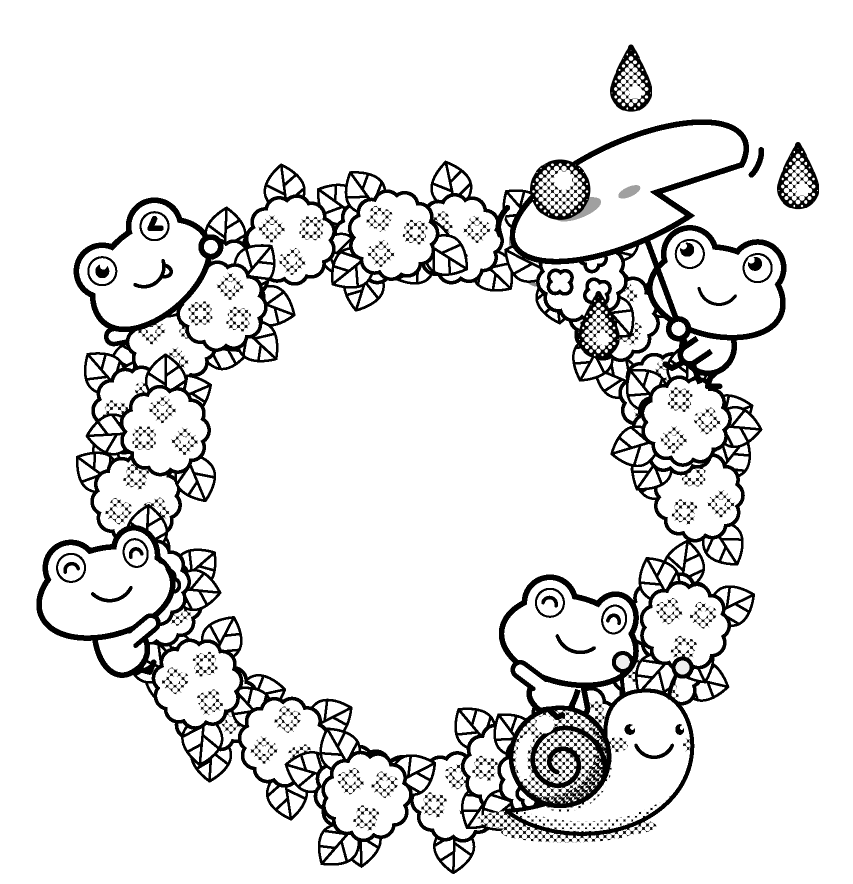 6月イラスト。紫陽花とカエルたちの飾り罫イラスト素材。