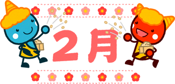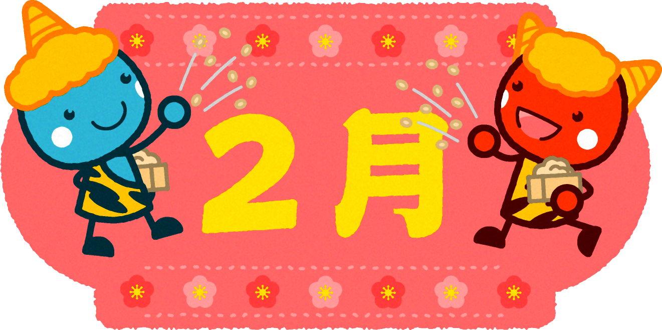 2月イラスト。2月の文字と鬼達イラスト素材。
