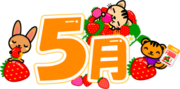 5月イラスト。5月の文字イラスト/苺狩りと動物素材。