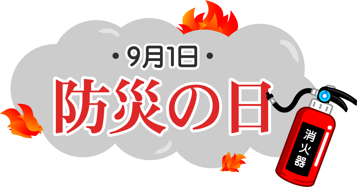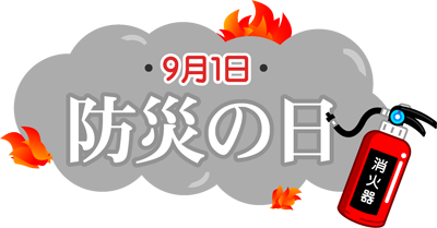 9月イラスト。9月1日、防災の日の文字イラスト/消火器で消火素材。