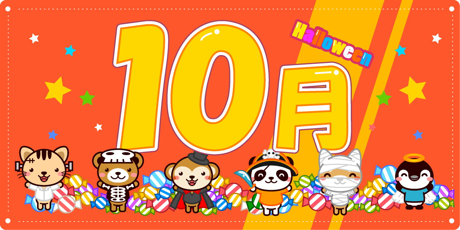 10月イラスト。秋の無料素材。10月の文字入りイラスト。フランケン、骸骨、ドラキュラ、海賊、ミイラ、天使等のコスプレをした動物達。猫、くま、猿、パンダ、犬、ペンギン等。かわいいハロウィンのキャラクターが入っています。