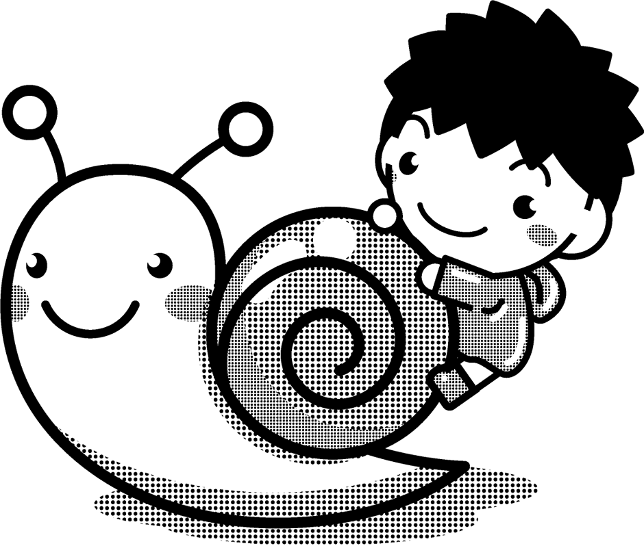 6月梅雨素材。カタツムリに乗った男の子イラスト/朱色素材。