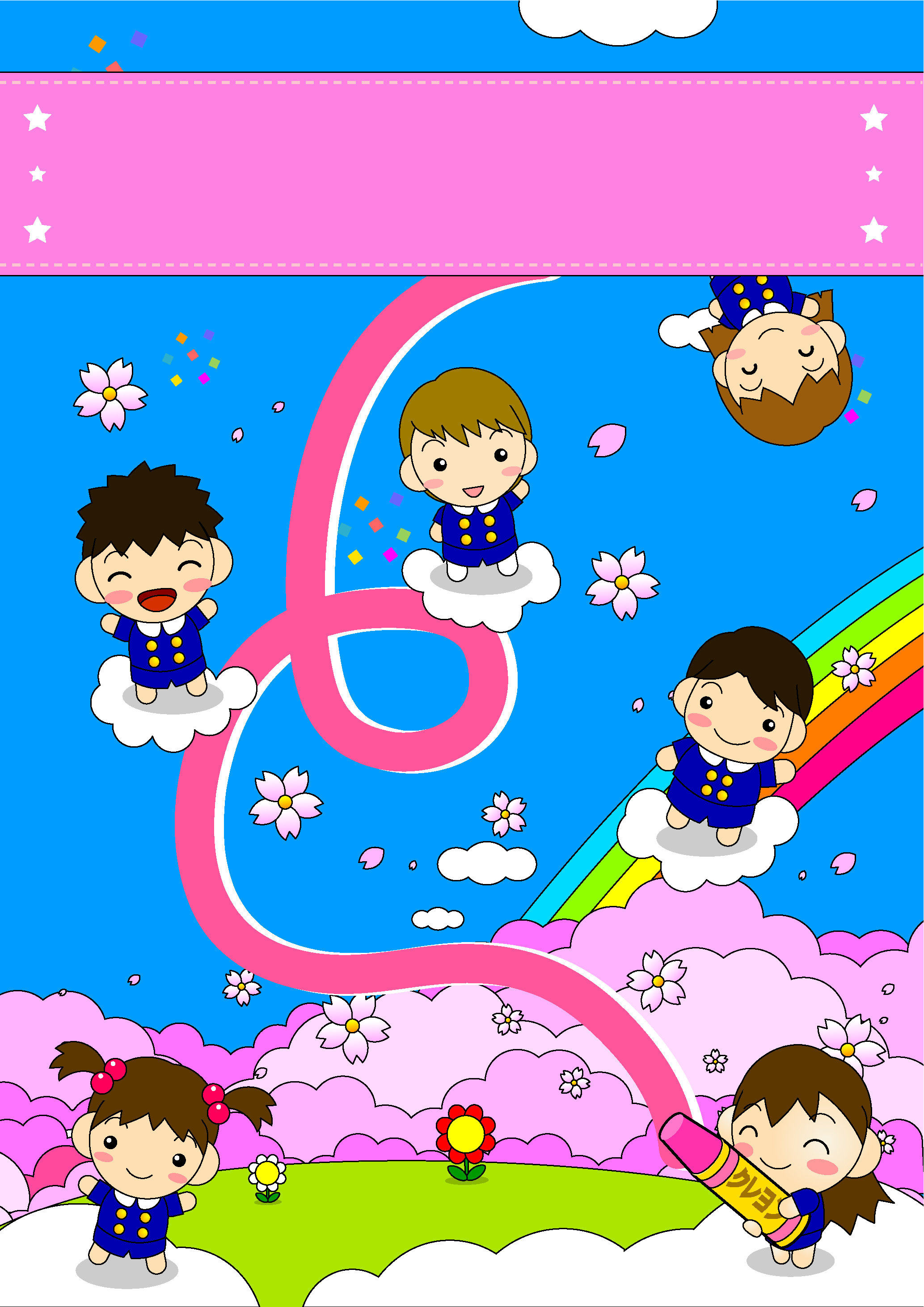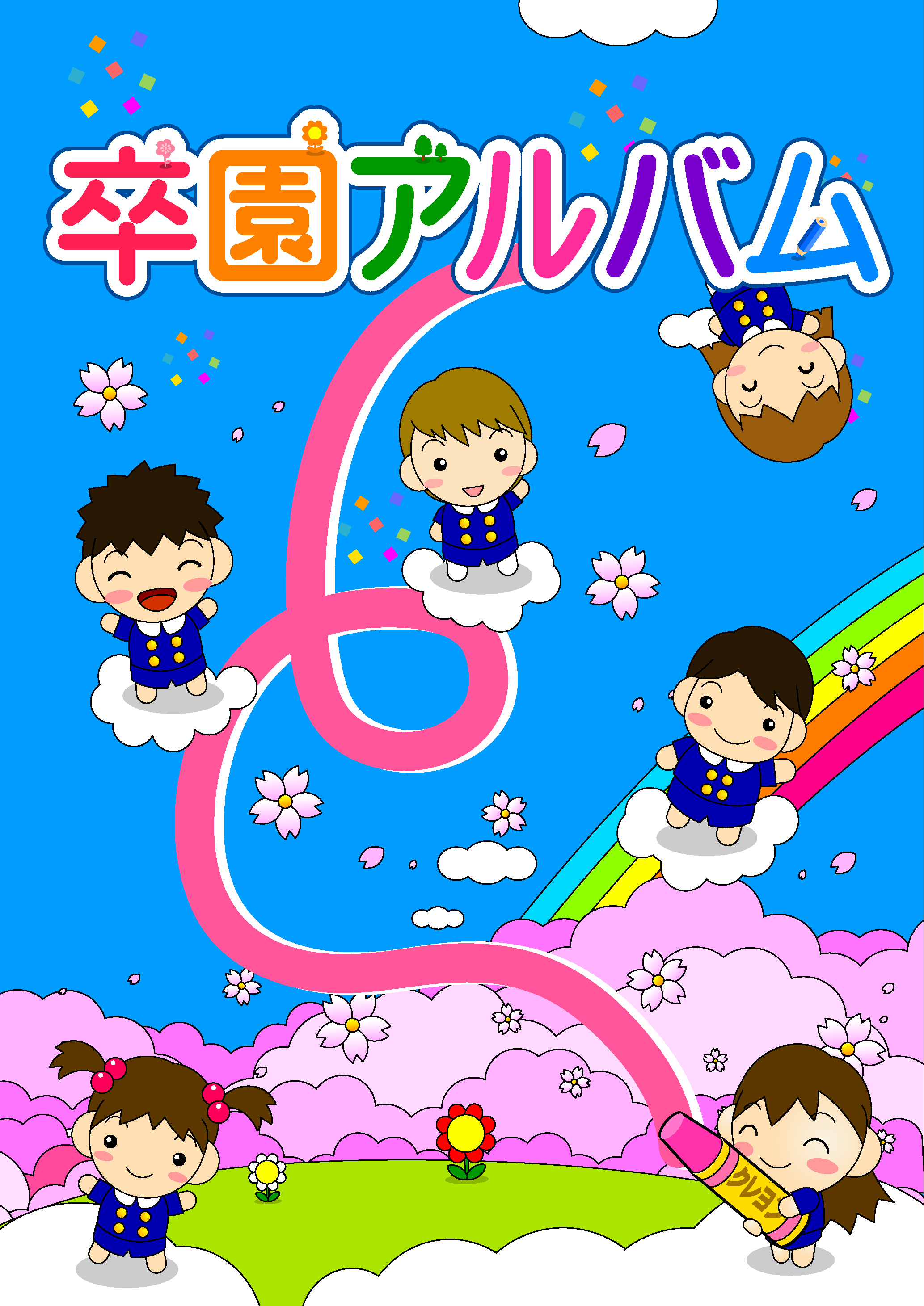 幼稚園の卒園アルバム。無料素材。ふわふわ雲と青空、桜と幼稚園児