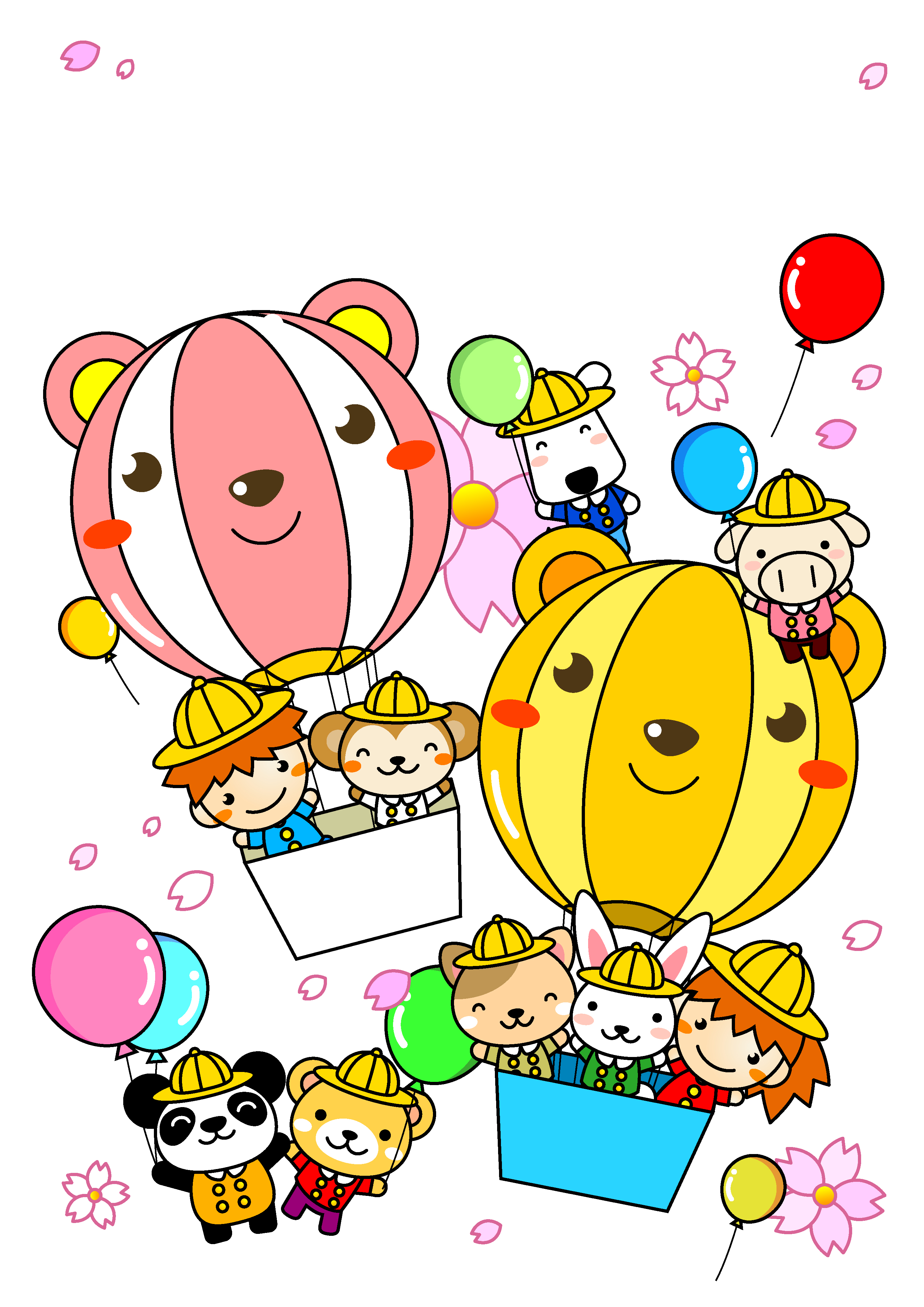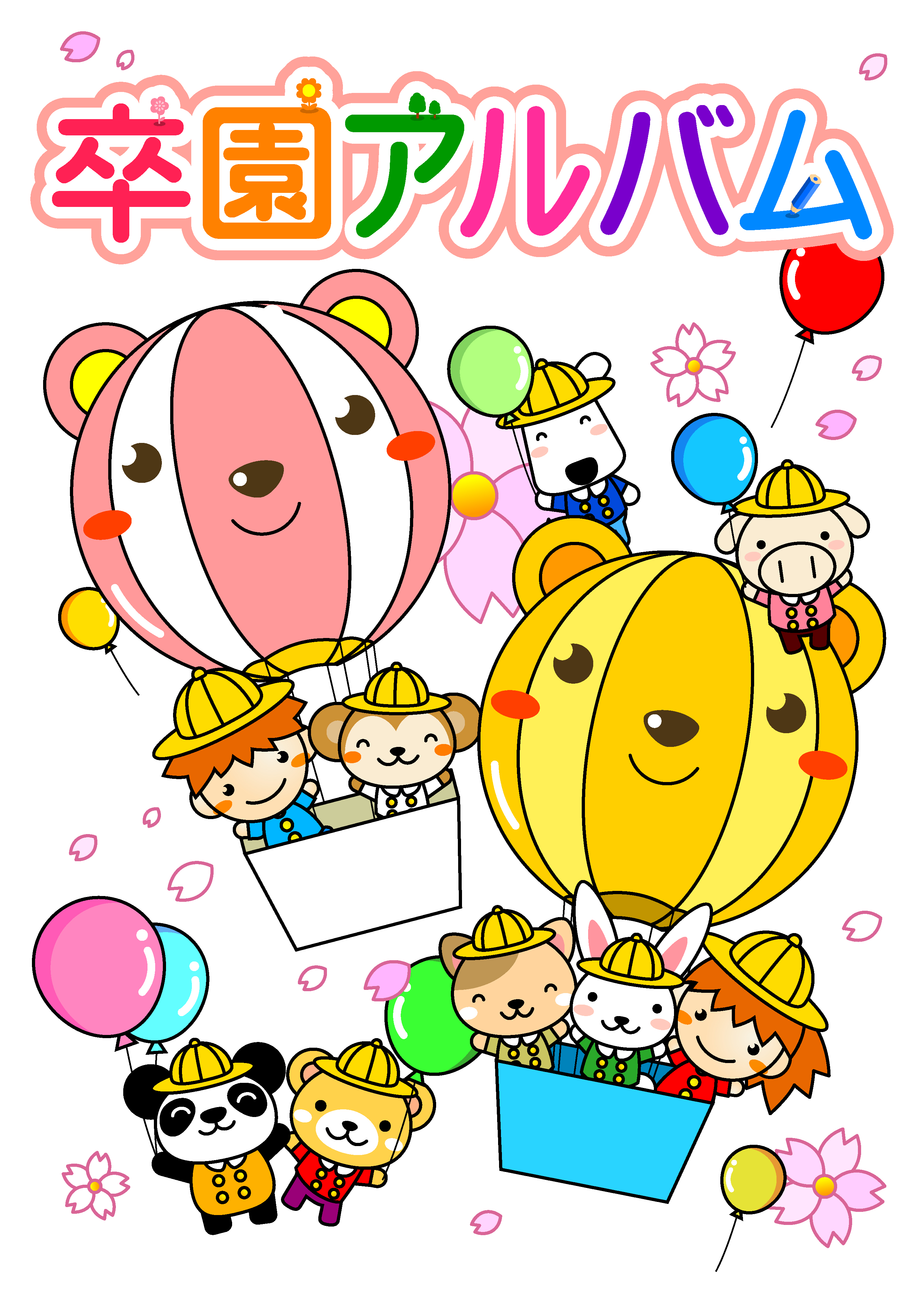 幼稚園の卒園アルバム。無料素材。かわいい気球と動物、子供達